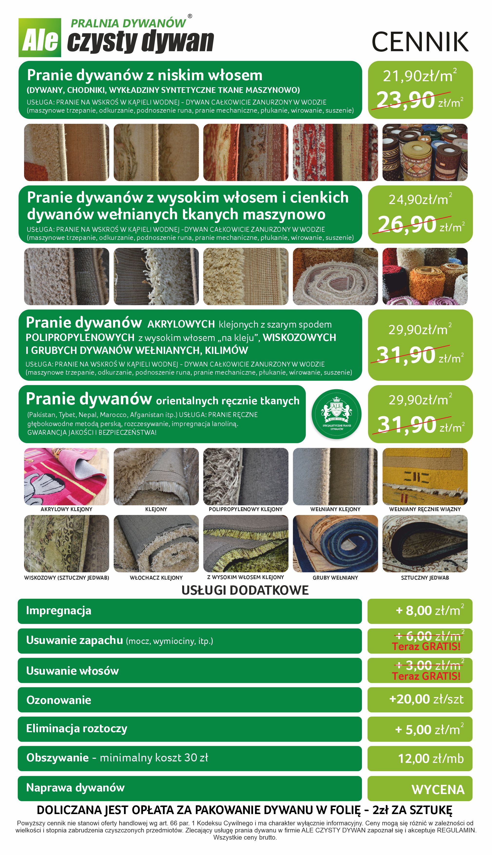 Dywany poniżej 1m2 są liczone jako 1m2.